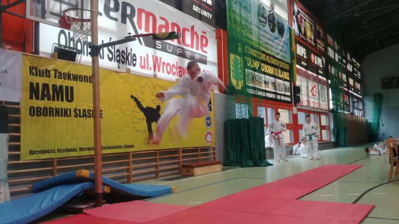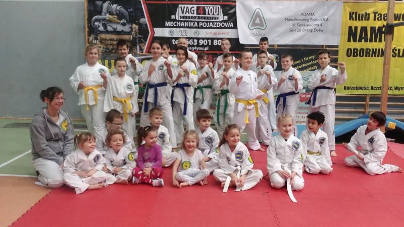20 stycznia 2018 r. w Obornikach Śląskich w hali sportowej Szkoły Podstawowej nr 1 przy ul. Kownackiego odbyły się zawody w Taekwon-do ITF. Do Obornik Śląskich przybyli młodzi adepci Taekwon-do ITF z Dolnego Śląska zrzeszeni w Ogólnopolskiej Organizacji Taekwon-Do ITF. Zawody były organizowane przez Klub Taekwon-Do ITF „NAMU” w ramach programu „Aktywna Gmina Oborniki Śląskie”. Zawody rozpoczęły się punktualnie o godzinie 9.00 przywitaniem wszystkich zawodników przez koordynatora federacji na Dolnym Śląsku Trenera Krzysztofa Machałę V DAN. Rywalizacja rozpoczęła się od konkurencji dla najmłodszych. Młodzi adepci Taekwon-Do mieli okazję zmierzyć się na „torze przeszkód” który oprócz prostych zadań zawierał również przeszkody związane z elementami Taekwon-do. W sumie w konkurencji udział wzięło około 20 zawodników. Kolejną, równie ciekawą konkurencją były „techniki szybkościowe”. Konkurencja polega na wykonaniu jak największej ilości kopnięć w tarczę w przeciągu 30 sekund. Tu również rywalizacja podzielona była na najmłodszych i trochę starszych. W okolicach godziny 12.00 rozpoczęła się walki na macie w „układach formalnych”. Na pierwszy ogień poszli taekowndocy posiadający 10 CUP (białe pasy). Układy formalne są jedną z ciekawszych dyscyplin w Taekwon-Do. Wymagają od zawodnika bardzo dobrej koordynacji i wykonywania układu najlepiej jak potrafi. Trzeba wspomnieć, że każde zawody są zwieńczeniem wielu godzin treningu, czasem bardzo monotonnego. Biorąc przykład z polskich skoczków narciarskich kolejną konkurencją były techniki specjalne, polegające na kopnięciu packi umieszczanej coraz wyżej. Odpowiednie wybicie się w górę jest tu bardzo ważne. I tak najmłodsi rozpoczęli rywalizację od elementu ustawione na wysokości 126 cm aby potem starsi mogli kopać ją na wysokości prawie 2 metrów na ziemią. Wszyscy uczestnicy zawodów otrzymali piękne szklane medale oraz dyplomy. Zwycięzcy poszczególnych konkurencji otrzymali dodatkowo packi treningowe. Zawody zakończyły się wspólnym zdjęciem oraz poczęstunkiem.