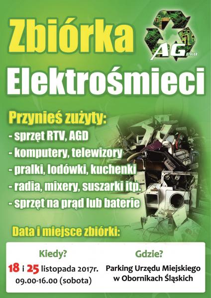 Szanowni Mieszkańcy ! Informujemy, że w dniach 25 listopada 2017r. (sobota) w godz. od 09:00 do 16:00 na terenie Obornik Śląskich zostanie przeprowadzony bezpłatny odbiór zużytego sprzętu AGD i RTV*