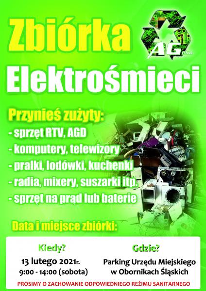 Szanowni Mieszkańcy ! Informujemy, że w dniu 13 lutego 2021r. (sobota) w godz. od 9:00 do 14:00 na terenie Obornik Śląskich zostanie przeprowadzony bezpłatny odbiór zużytego sprzętu AGD i RTV*