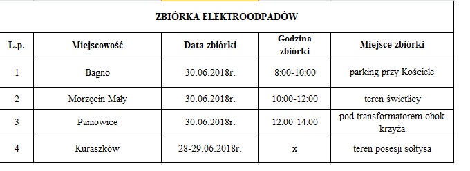 Informujemy, iż w najbliższych dniach zostanie zorganizowana zbiórka elektroodpadów na terenach wiejskich według podanego niżej harmonogramu.