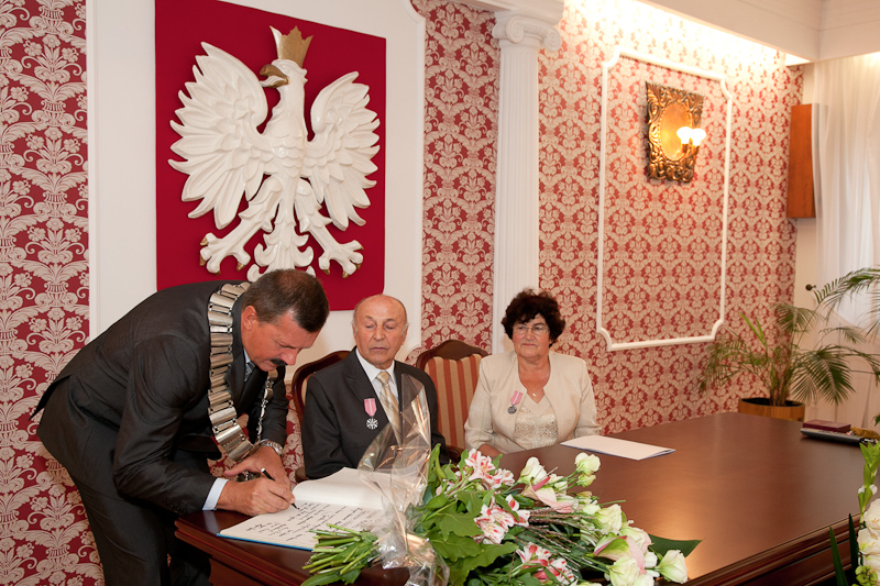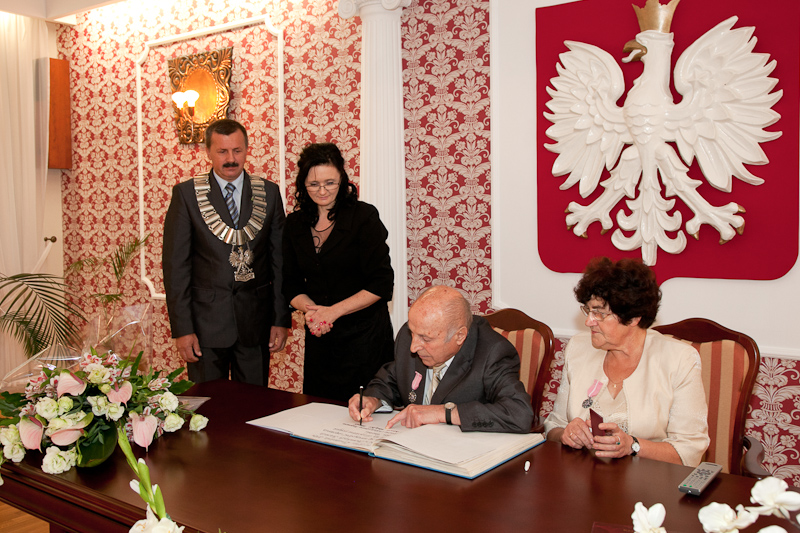 W minioną sobotę w USC w Obornikach Śląskich miała miejsce uroczystość z okazji 50-lecia pożycia małżeńskiego państwa Antoniny i Władysława Długoszów. Po odnowieniu przysięgi małżeńskiej przy licznie zgromadzonej rodzinie, Pan Burmistrz Obornik Śląskich Sławomir Błażewski uroczyście odznaczył jubilatów medalami od Prezydenta RP Bronisława Komorowskiego, a także wręczył pamiątkowy list gratulacyjny. Należy wspomnieć, iż było to już drugie odznaczenie w karierze Państwa Długoszów. W 2009 roku zostali oni uhonorowani medalami „W uznaniu zasług” przyznawanymi przez Radę Miejską Obornik Śląskich za zaangażowanie w działalność na rzecz Naszej Gminy. Zarówno Pani Antonina jak i Pan Władysław przez prawie 40 lat pracowali jako nauczyciele, a także jako Dyrektorzy Szkoły Podstawowej w Kowalach. Pan Władysław pełnił także funkcję Sołtysa wsi w Kowalach oraz Radnego Rady Miejskiej w Obornikach Śląskich. Po uroczystości wszyscy goście wpisali się do Księgi Pamiątkowej oraz odśpiewali tradycyjne „Sto Lat”. My także składamy jubilatom najserdeczniejsze życzenia oraz gratulujemy tak imponującej rocznicy.
