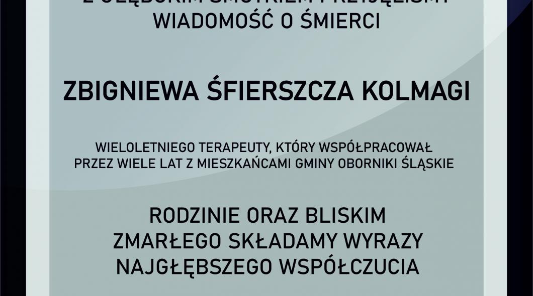 Z głębokim smutkiem przyjęliśmy wiadomość o śmierci Zbigniewa Śfierszcza Kolmagi (wieloletniego terapeuty, który współpracował przez wiele lat z mieszkańcami gminy Oborniki Śląskie). Rodzinie oraz bliskim zmarłego składamy wyrazy najgłębszego współczucia.
