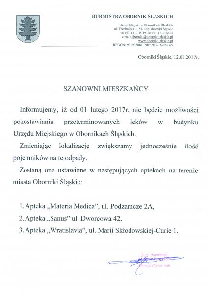 Informujemy, iż od 1 lutego 2017 roku nie będzie możliwości pozostawienia przeterminowania leków w budynku Urzędu Miejskiego w Obornikach Śląskich. Zmieniając lokalizację zwiększamy jednocześnie ilość pojemników na te odpady. Zostaną ustawione w następujących aptekach na terenie miasta: