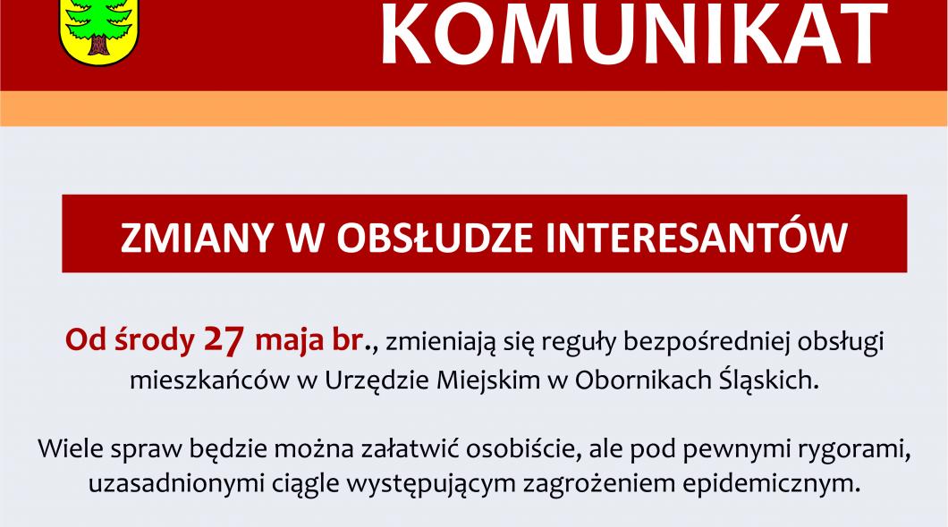 Od środy, 27 maja br., zmieniają się reguły bezpośredniej obsługi mieszkańców w Urzędzie Miejskim w Obornikach Śląskich. Wiele spraw będzie można załatwić osobiście, ale pod pewnymi rygorami, uzasadnionymi ciągle występującym zagrożeniem epidemicznym.