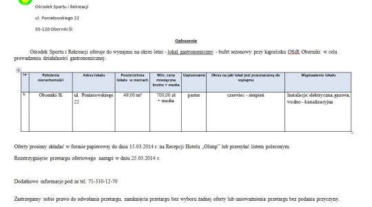 OSiR zaprasza do skladania ofert na wynajem w okresie letnim lokalu gastronomicznego przy basenie