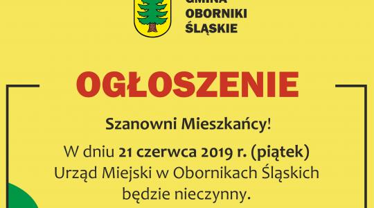 Informujemy, że Urząd Miejski w piątek 21 czerwca będzie nieczynny.